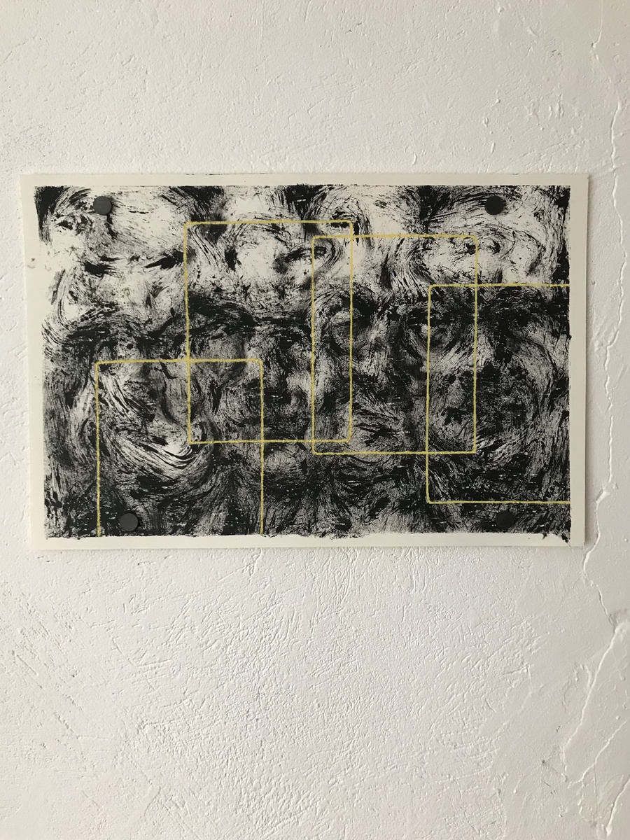 «Переход 6» 28/43 см. Бумага, акрил, монотипия, сухая кисть, сграффито. В серии работ «Переход» отражена идея непостоянства и непрерывного становления, когда человек не есть некое фиксированное я, застывшая форма, а скорее нечто неуловимое, становящееся я. Эта иллюзия фиксированности, пребывания неким собой, создается через имена, в частности слова или через знаки. Например, на работах можно увидеть рамку идентификации лица, которая применяется в электронных системах распознавания лиц (в камерах смартфонов и в соцсетях: «узнаёте этого человека?»). Это условный знак, который повторяет всё ту же игру в фиксированность, которую мы проецируем на динамические процессы