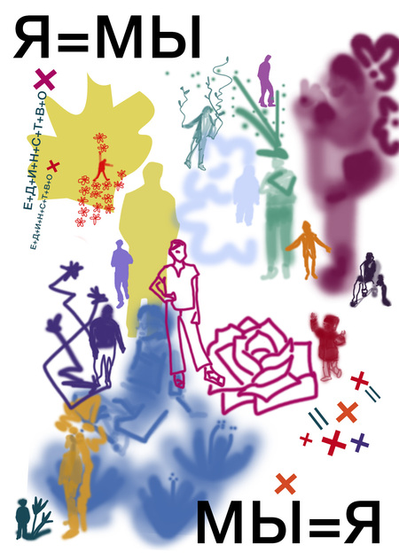 Мой плакат — это «сад», где люди разной плотности, цвета, размера и формы растут в одном направлении, и именно в этом проявляется их единство
