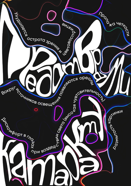 Qatarkta is a disease that affects one in six people over the age of forty. With my poster, I want to draw the attention not only of people with a confirmed cataract diagnosis, but also of those who will be familiar with its symptoms. The project encourages people to go to the centre for early detection and treatment, as patients often ignore primary signs. People are familiar with the most popular symptoms of cataracts, so I’m paying attention to the less famous ones. In my poster, I use color stains, referring to the symptoms of cataracts: the disfigurement of color and the appearance of coloured ores when looking at the light source. In the case of visual impairment, patients have to use increasing reading glasses, which is why printing is distorted.
