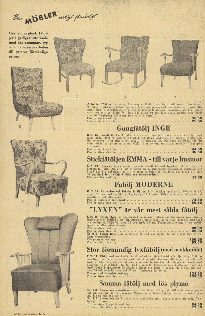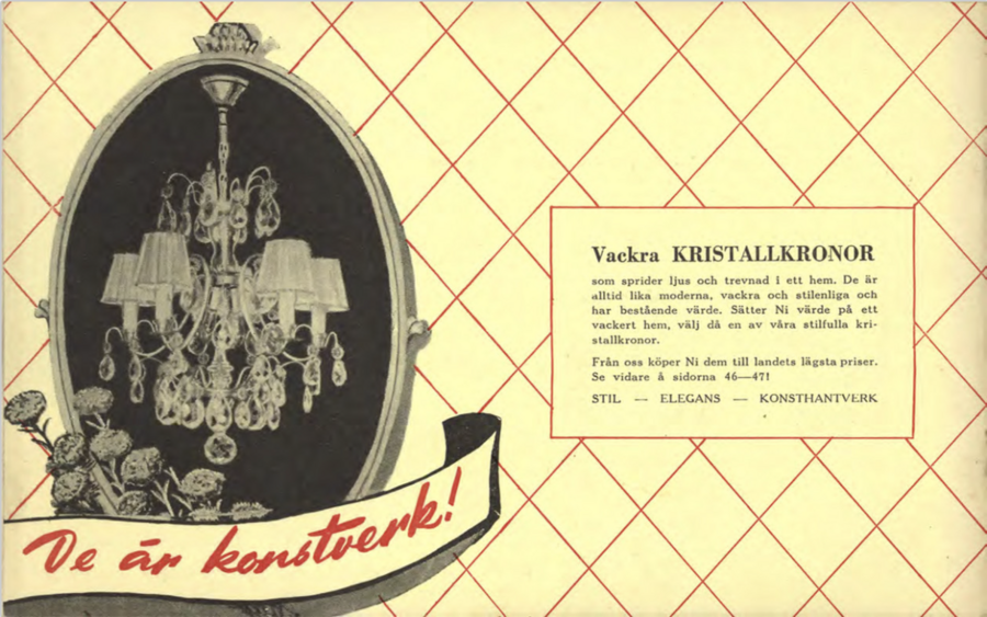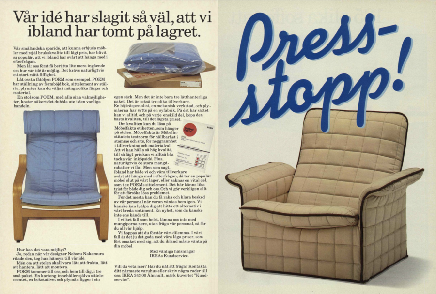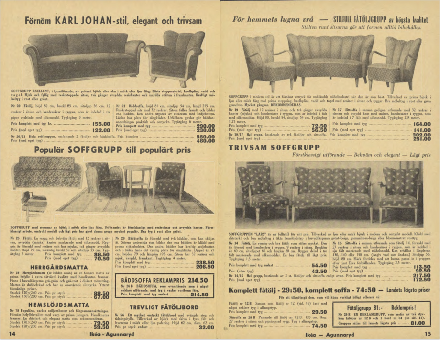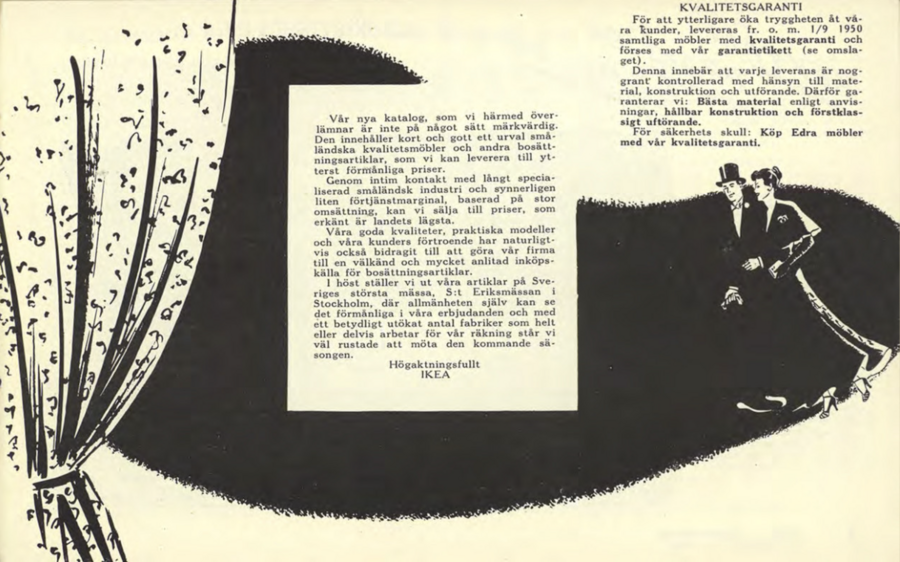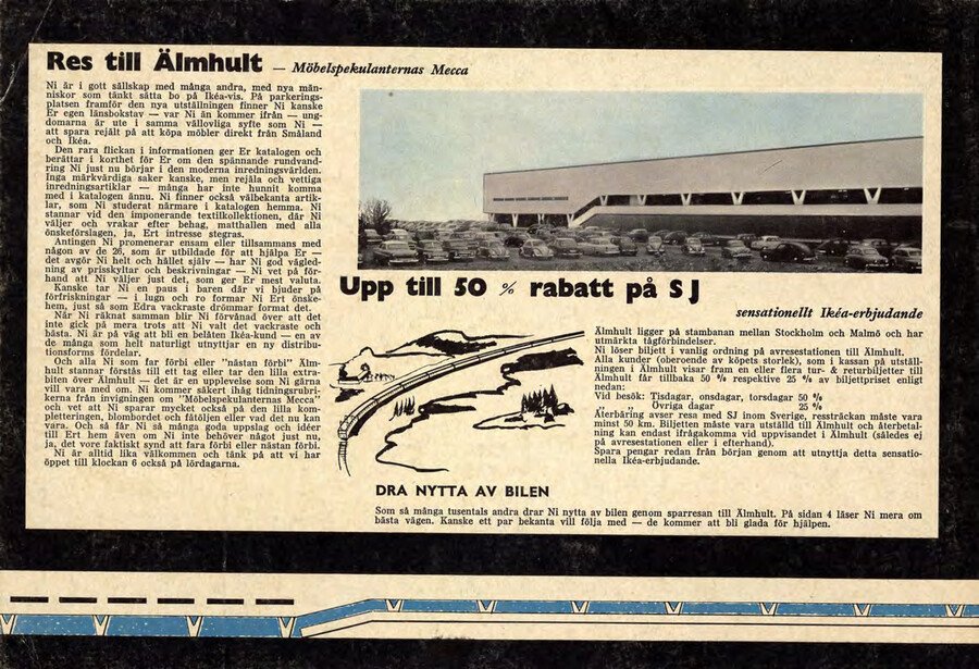 Рекламное объявление IKEA для мебельной ярмарки, 1950 г. показывает, что в рекламных коммуникациях гротескные шрифты в заголовках нередко сочетались с элементами леттеринга. Изображений товаров в рекламе могло и вовсе не быть.