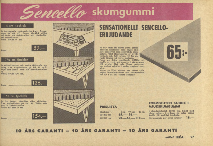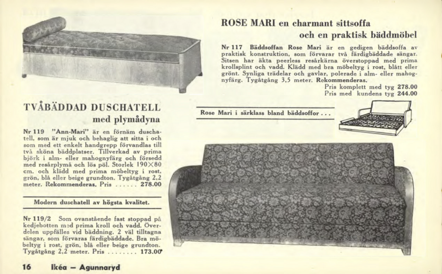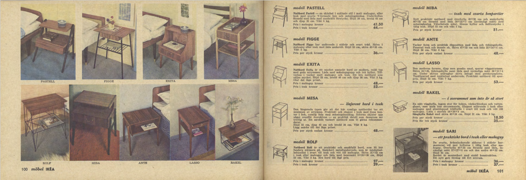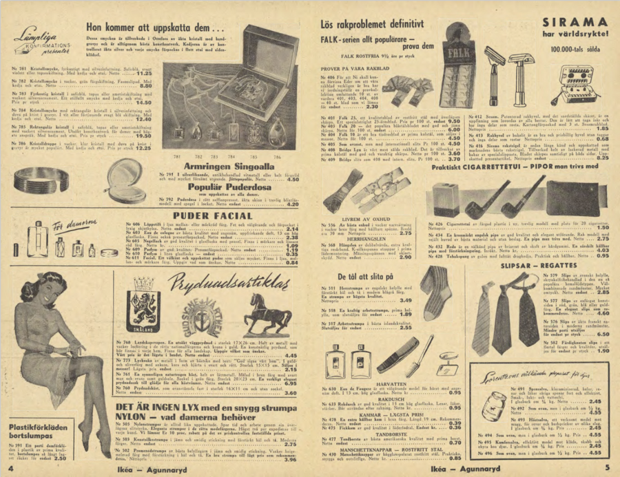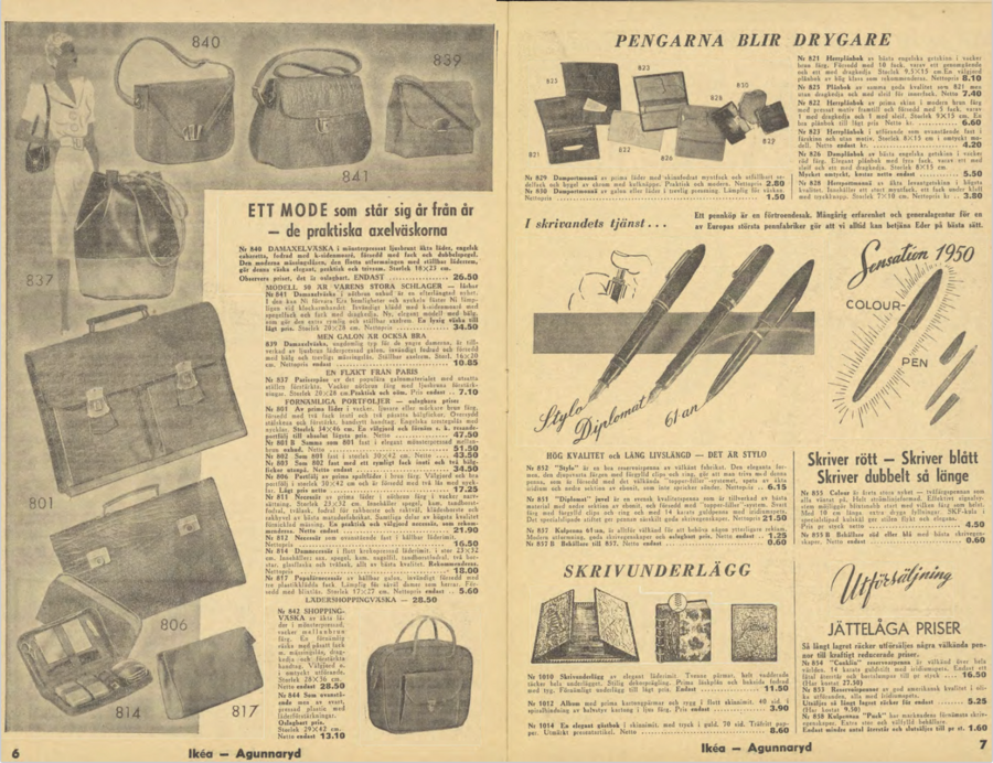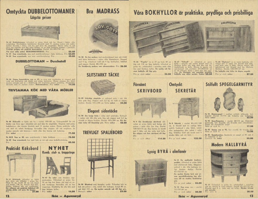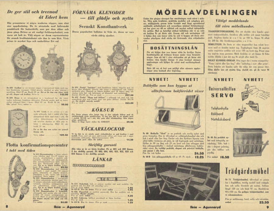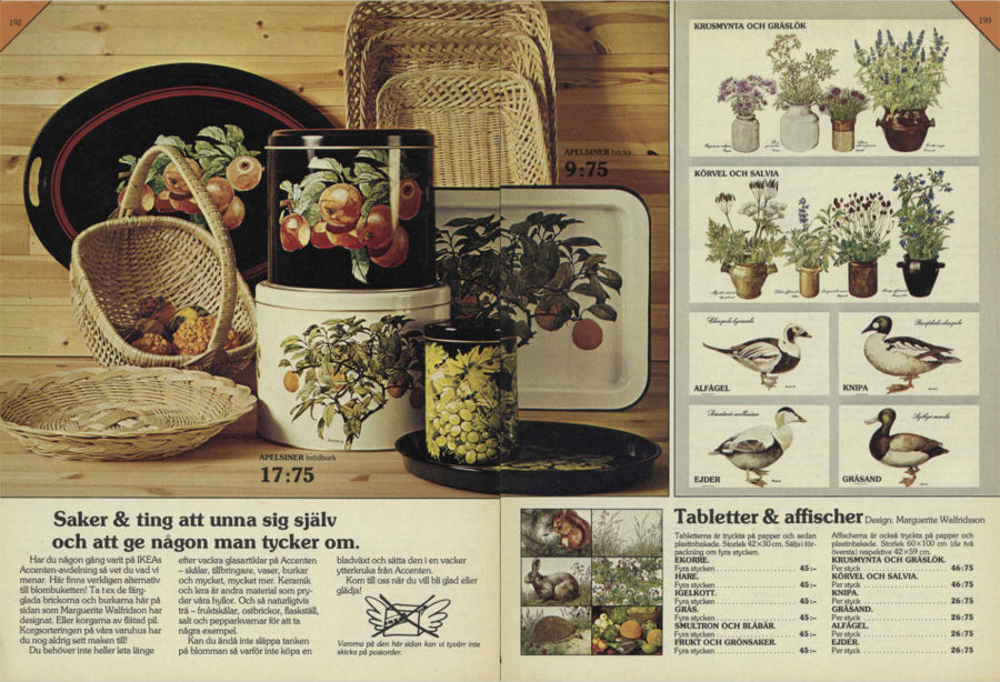 Типографика разнится от акцентных декоративных шрифтов в заголовках до строгих гротесков в служебной информации и описаниях товаров. Вёрстка плотная, выровненная по левому краю, без лишних декоративных элементов. Такое решение было типично для послевоенной коммерческой печати. IKEA уже стремилась к ясности и прямой демонстрации товара.