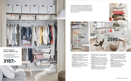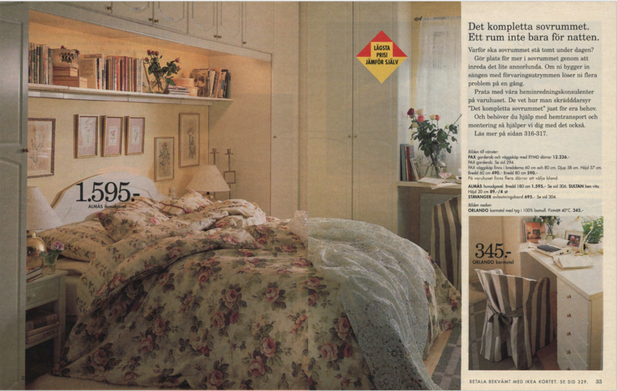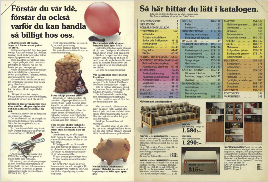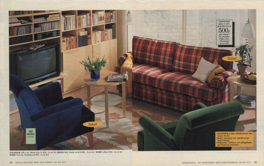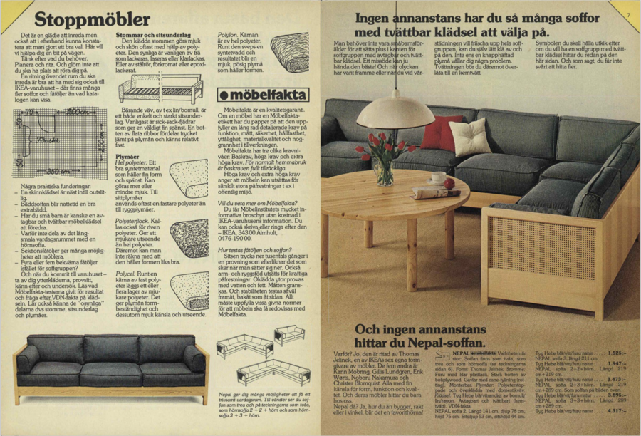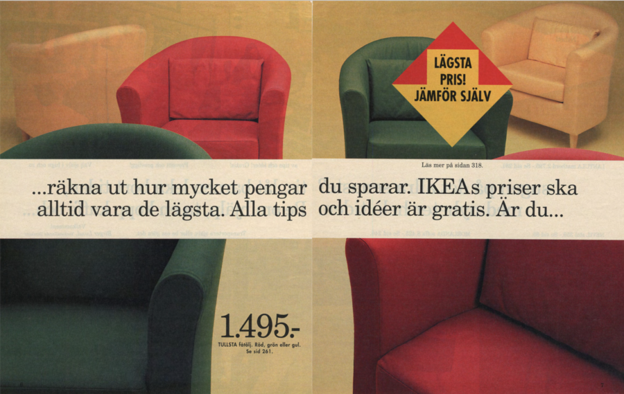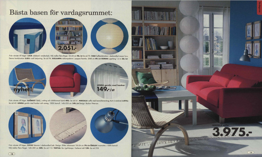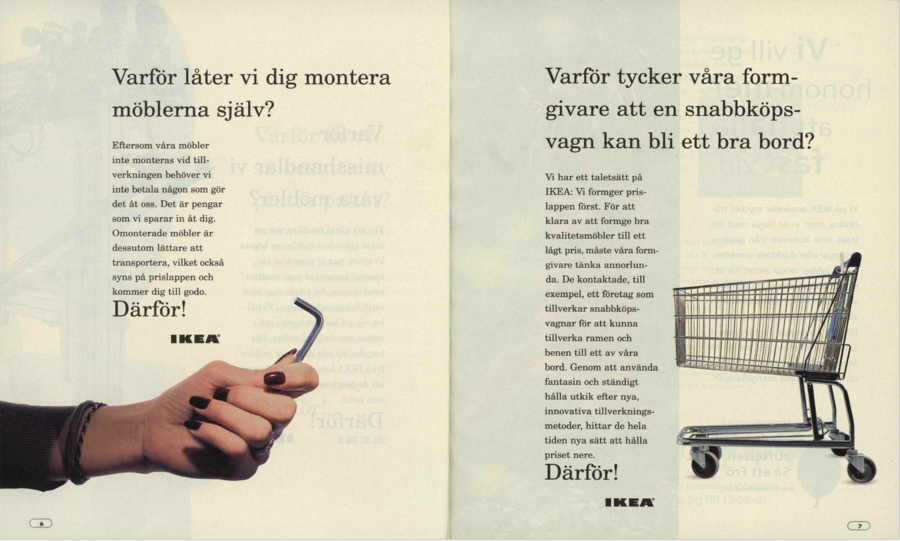 На примере первого каталога можно увидеть ранний визуальный язык IKEA, основанный на функциональности и экономной вёрстке. Композиция создаёт простой, но логичный маршрут взгляда. Иллюстрации товаров органично сочетаются с текстовыми блоками, однако не являются главными.