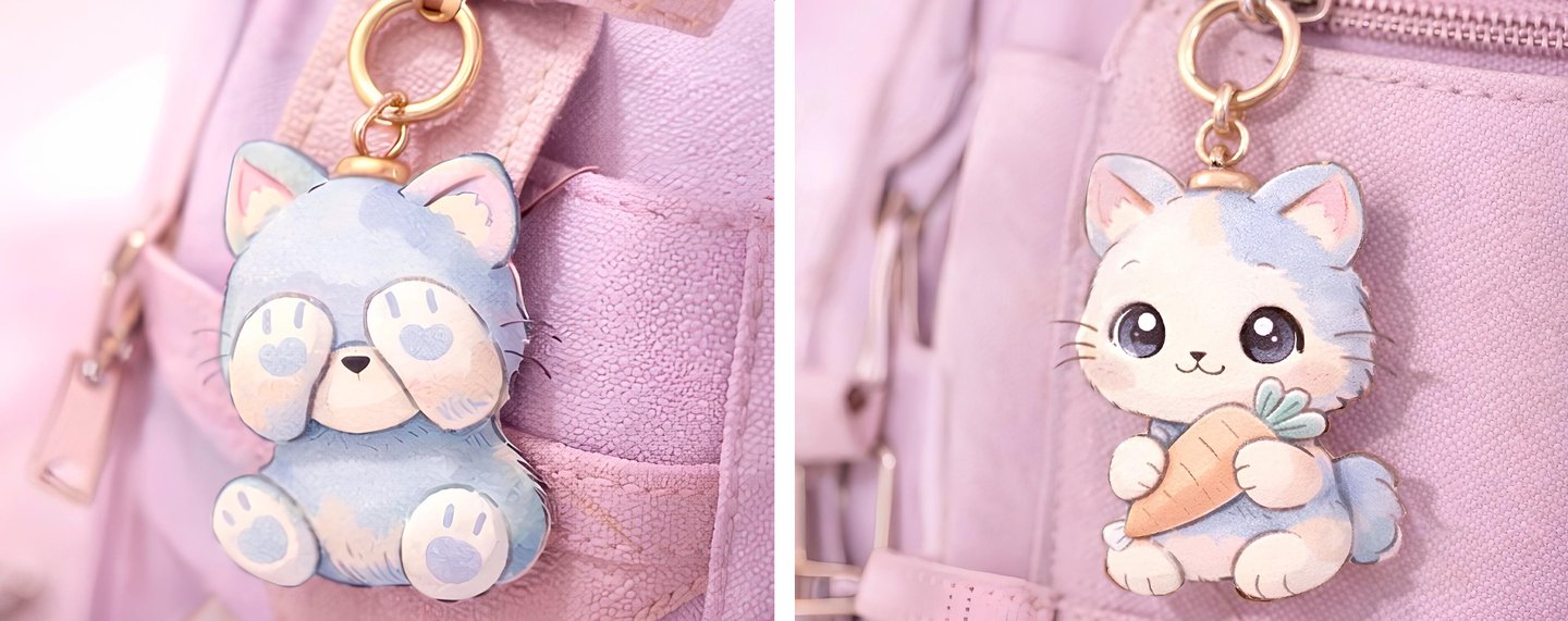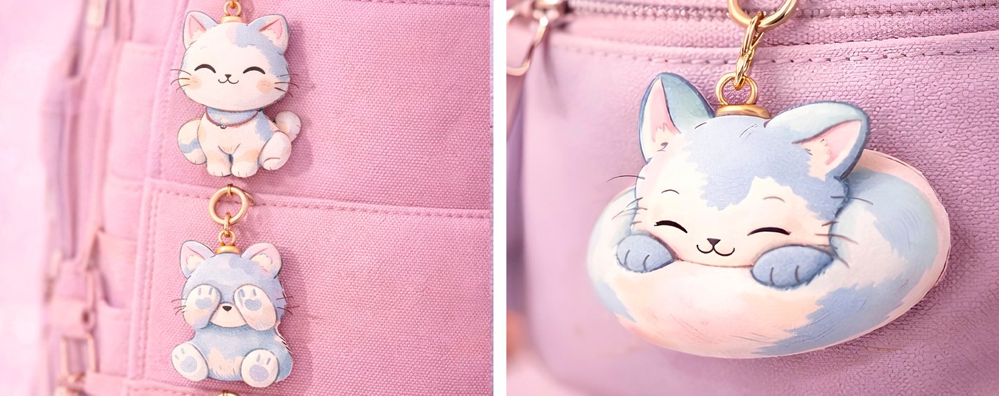 Все шармы довольно небольшого размера, цветовая палитра — экрю, розовый и голубой. Брелки выполнены в едином стиле, что побуждает людей начать коллекционировать изделия.