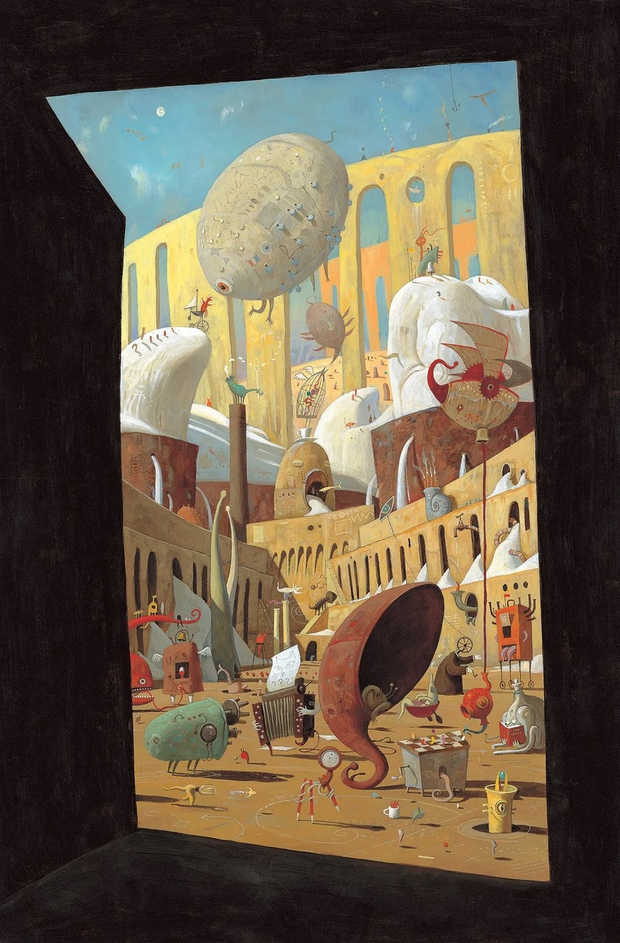 Гигантская архитектура — ещё один важный элемент. Танн использует здания, которые напоминают смесь индустриальных конструкций, фантастических башен и незнакомой механики. В «The Arrival» высотные фасады и сложные агрегаты давят на героя своей массивностью. В «The Lost Thing» огромный индустриальный город, состоящий из однообразных серых блоков, буквально «заглушает» и прячет индивидуальность персонажей. Эти архитектурные формы не просто декорации — они символизируют масштаб мира, в котором человеку трудно найти место.