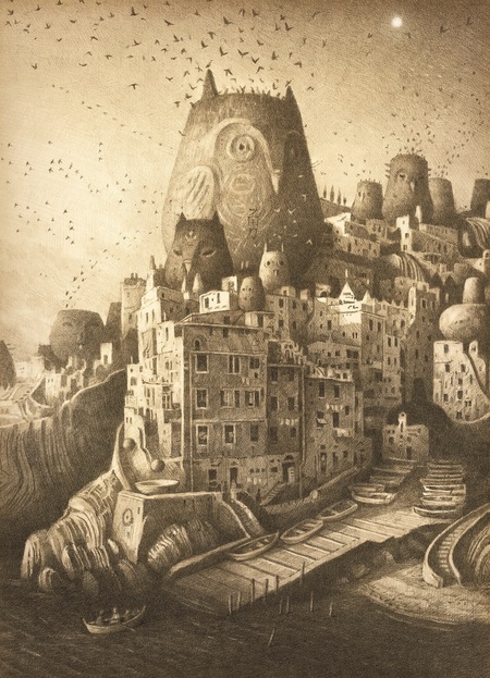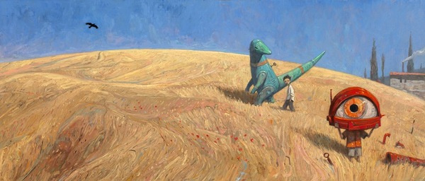 Работы Шона Танна привлекли меня именно этой способностью — соединять фантастическое и повседневное так, что внутри воображаемых миров узнаются собственные переживания. Его приглушённые города, странные существа, тихие персонажи и просторные, почти безмолвные среды говорят о внутреннем состоянии человека гораздо глубже, чем прямое повествование.