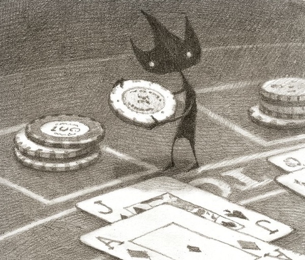 Другой приём — высокий ракурс, когда персонаж изображён сверху, как маленькое пятнышко среди большого пространства. В иллюстрации к рассказу про «бумажного водолаза» из той же книги Танн показывает ребёнка в огромном школьном бассейне, где пустота воды и строгость архитектуры делают фигуру героя почти теряющейся. Высокая перспектива превращает персонажа в маленький элемент мира, усиливая тему уязвимости.