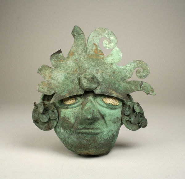 Маски Теотиуаканa (II–VI вв. н. э.) представляют собой уникальное явление в месоамариканском искусстве. В отличие от портретных масок других культур, теотиуаканские маски характеризуются строгой стандартизацией и идеализацией черт лица. Выполненные из цельных блоков зеленого камня (серпентина, нефрита) или обсидиана, они демонстрируют канонизированный образ с овальным лицом, широкими бровями, узким носом и небольшим ртом. Особенностью этих масок является отсутствие отверстий для глаз и рта, что свидетельствует об их исключительно ритуальном назначении.
