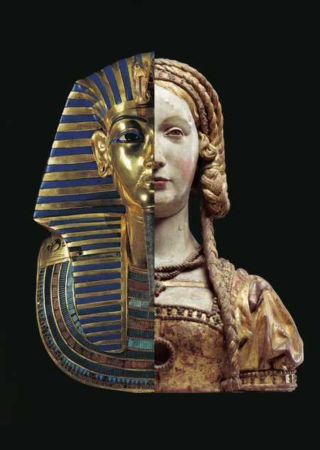 Погребальная маска Тутанхамона, изготовленная из картонажа и золотa, представляет собой идеализированный образ фараона, воплощающий концепцию вечности. В отличие от микенских масок, египетские не только сохраняли облик умершего, но и служили вместилищем для его души (Ка), обеспечивая ей защиту и возможность выживания в загробной жизни. Маскa Тутанхамонa, как и маски Юйя и Туйя, подчёркивает связь с богами и вечность власти, отражая религиозные и магические верования древнеегипетской цивилизации.