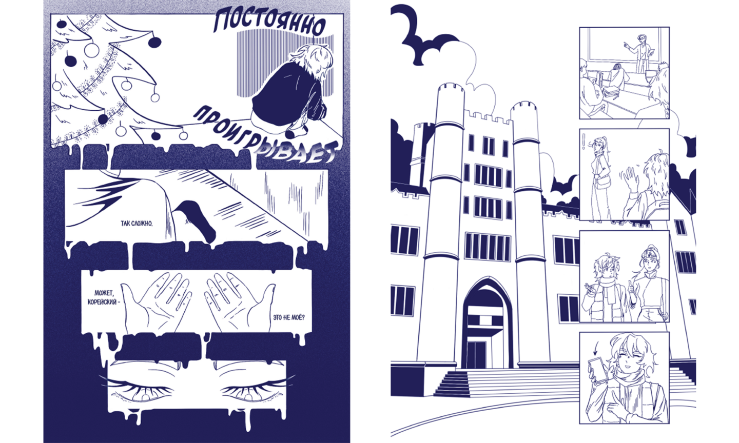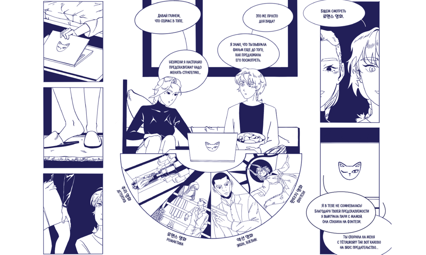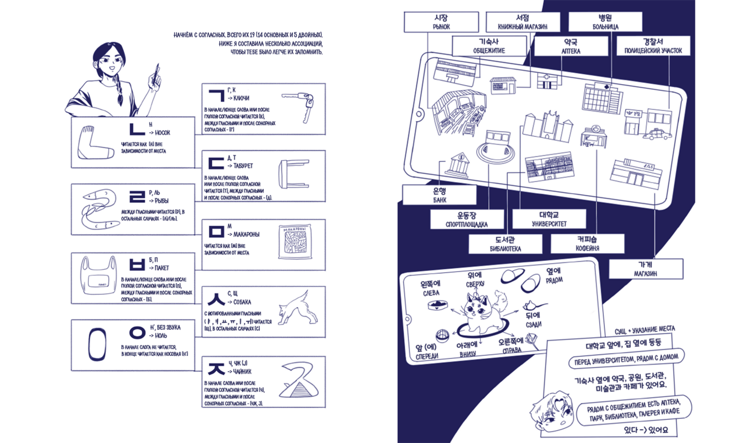 Комикс «Тея в Корее» поможет разобраться в основах корейской грамматики, выучить множество полезных корейских слов и особенности их применения. Это удобный самоучитель для тех, кто хочет поближе познакомиться с уникальным языком кейпопа, вебтунов и манхв.