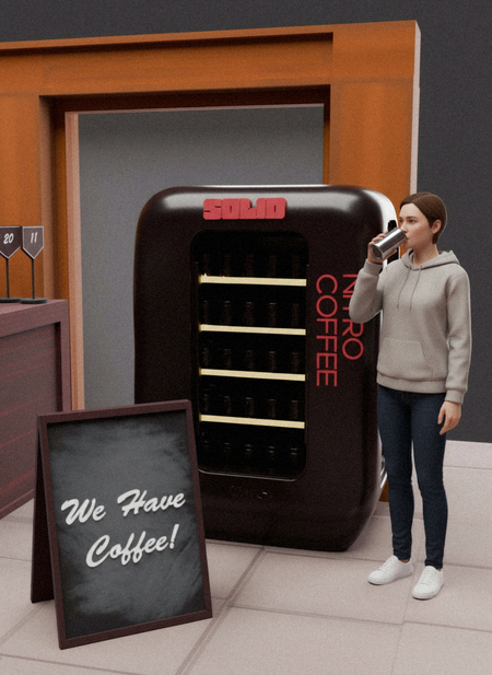 Торговый автомат — точка продажи и знакомства с брендом холодного газированного кофе, ориентированном на комфорт и быстрое знакомство с продукцией бренда. Задачей автомата является познакомить потенциальных покупателей с новым и необычных вкусом кофе.