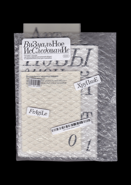 Визуальное исследование состоит из шести отдельных глав, одна из которых техническая и содержит в себе вступление, библиографию и заключение. Отстальные пять глав содержат темы, выделенные в рубрикаторе: повышенный комфорт, экономия пространства, мультисенсорность, экологичность и арт-объект. Формат и верстка каждой из глав выбраны в соответствии с функцией посуды, о которой идет речь. По этим же критериям выбиралась бумага для печати каждой из глав.