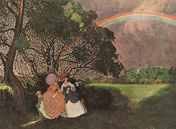 Картины «Карнавальный вечер» и «Радуга» выполнены приблизительно в одно время и схожи не только сюжетно, но и композиционно: пейзаж, уделяющий большое внимание шумной массе переплетенных древесных веток, которая резко прерывается, открывая по большей части монотонное небо, одно яркое пятно посреди этого неба и небольшие человеческие фигуры, уравновешивающие его с другого края холста.