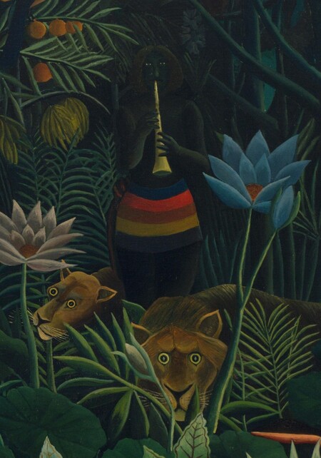 Однако картину Руссо, на мой взгляд, немного сложнее прочитать за счет отсутствия явного композиционного центра. В первую очередь взгляд зрителя привлекает девушка, но ее расположение в холсте вновь кажется несколько контринтуитивным. Вместе с этим ее указующий палец привлекает внимание к правой половине холста, заставляя вглядываться в чащу, где оно обращается сперва на львиц в траве и только потом — на почти слившуюся с фоном обезьяну с дудкой, завершающую композиционный треугольник.