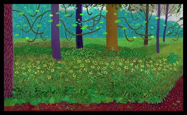 Так, картины «Лес сновидений» и «Под деревьями» обе состоят из крупных пятен достаточно локального цвета и имеют минимальный сюжет, вместо этого делая акцент на повторяющихся паттернах на деревьях и траве. Несмотря на сходства, производимое ими впечатление сильно отличается, и, на мой взгляд, это происходит в первую очередь за счет расположения деревьев. Картина Дэвида Хокни нарисована с ракурса, подразумевающего, что зритель находится внутри леса, выглядывающие по бокам части стволов и веток добавляют ей определенной естественности. Ракурс на картине Генералича же очень нейтрален: художник смотрит на лес не снизу или сверху, а напрямую, изображает деревья «в полный рост» и во всех деталях.