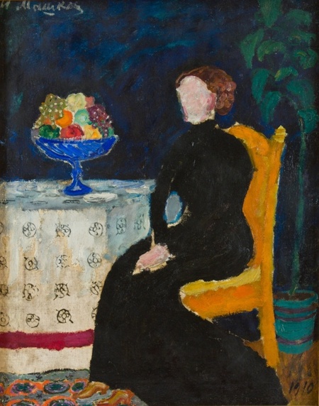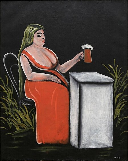 Это «Женщина с кружкой пива» Пиросмани, на удивление напоминающая своим несколько тревожным тоном авангардную «Женщину у стола» современника Ильи Машкова. Содержание обеих картин минимально: сидящая, стол, пустой за исключением одного объекта, уходящая во тьму зелень на фоне и неопределенное пространство за спиной. Цвета достаточно плоские, мазки несколько неровные, у некоторых предметов дрожащие белые очертания, в то время как другие теряются в черноте.