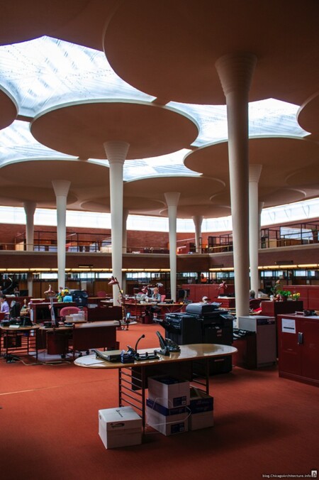 В Johnson Wax Headquarters этот природный мотив проявляется особенно ясно. Из-за этого пространство воспринимается как искусственный лес, где вертикальные опоры создают сеть мягких, разветвлённых направлений.