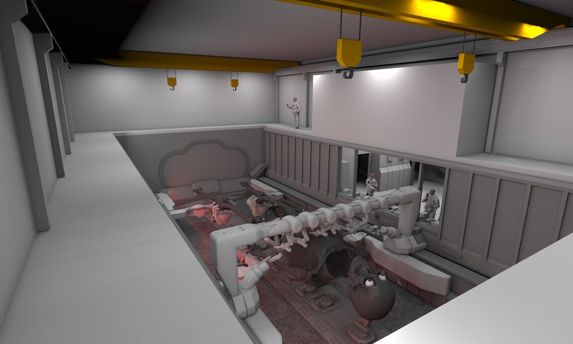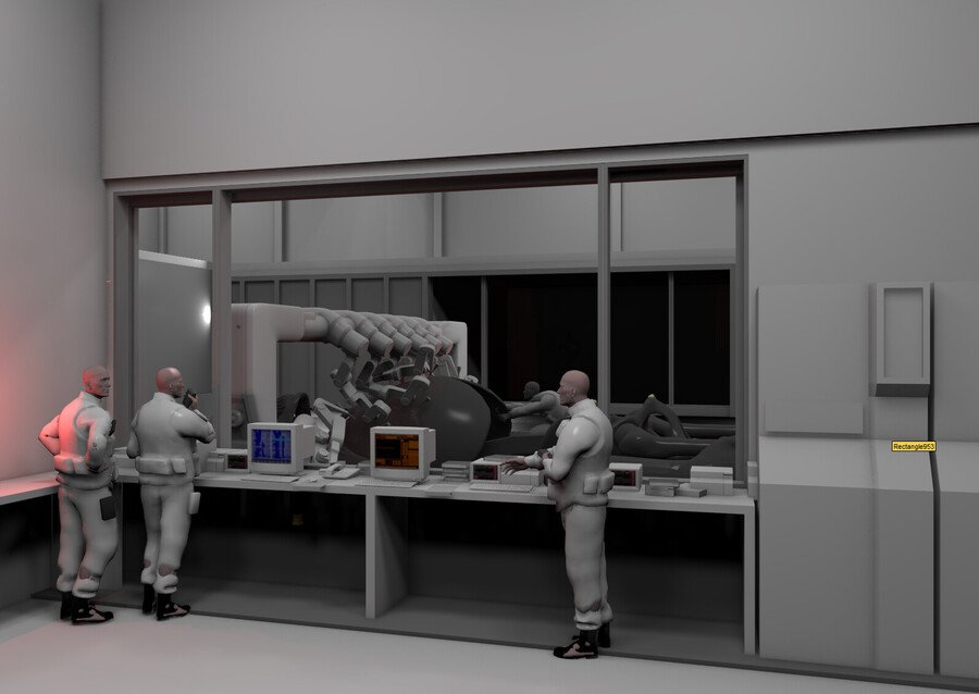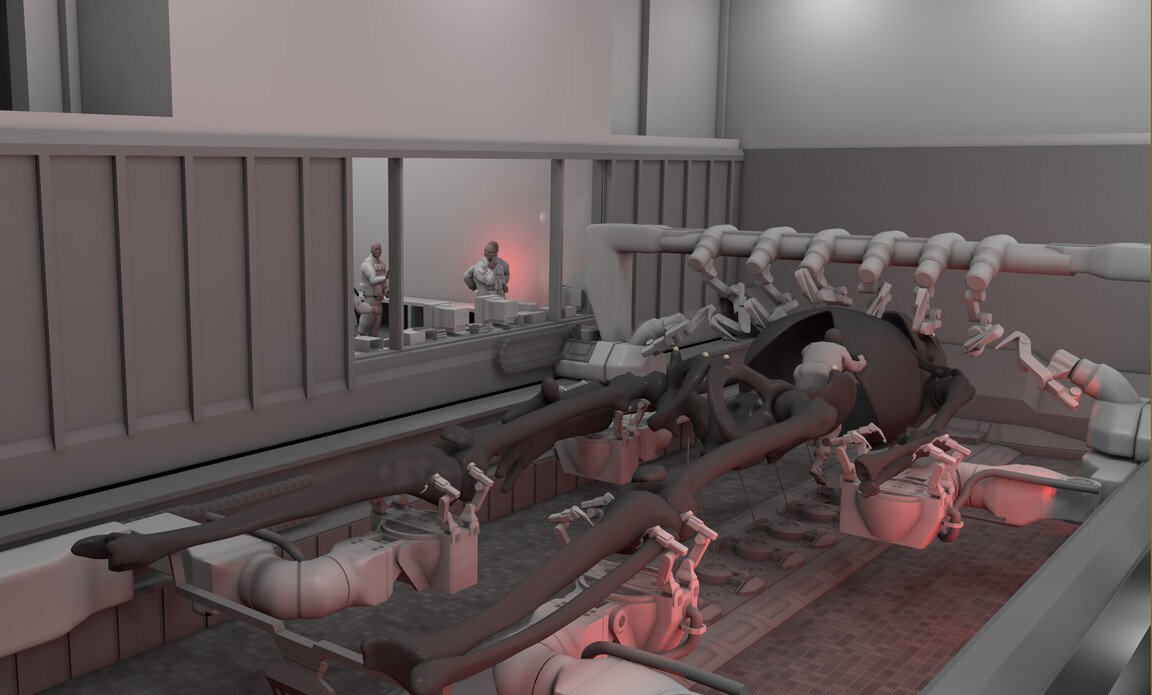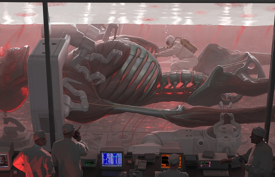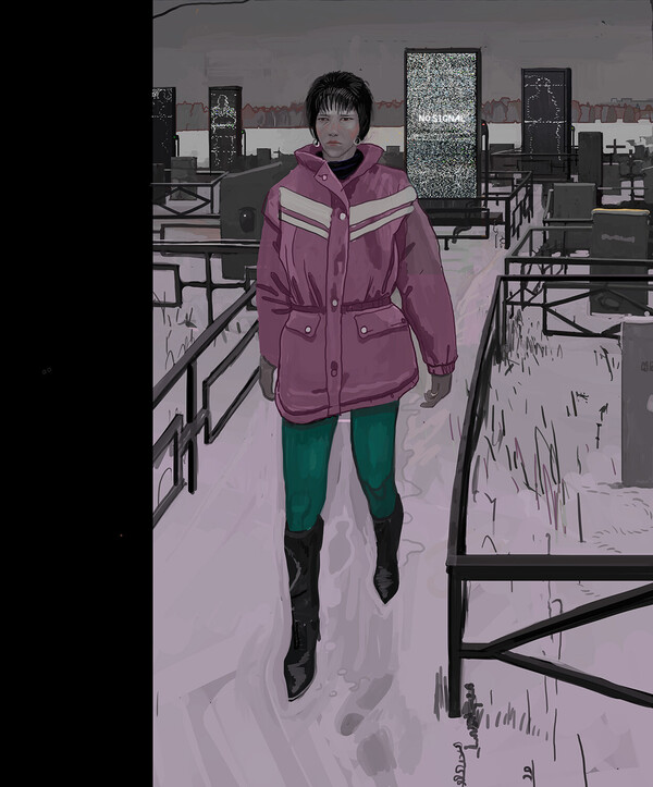 Многослойная глубина организует пространство как замкнутую систему, где маленькие фигуры лаборантов оказываются запертыми в архитектурном организме. Ограниченная цветовая палитра и стерильная атмосфера визуализируют медицинскую метафору дистопии как «аномального положения» [2, с. 1]. Контрастное освещение создает иерархию — яркая фигура девушки становится смысловым центром, тогда как остальные персонажи растворяются в техногенной среде. Исчезающие розовые и алые оттенки, подобно «уходящему закату», символизируют последние следы человечности в кибернетическом пространстве.