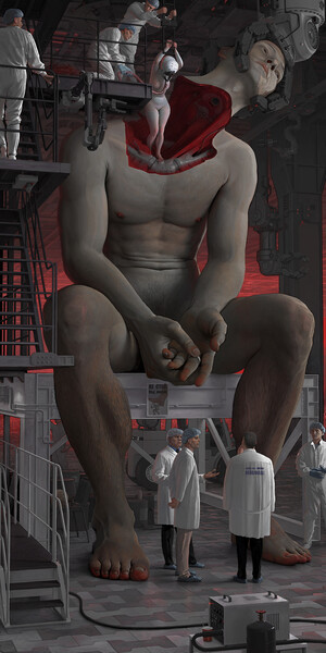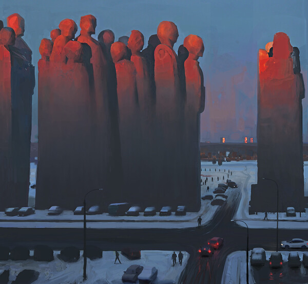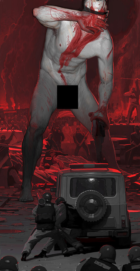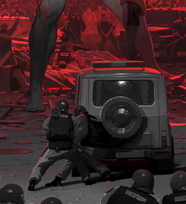 В другой работе гипертрофированный масштаб используется для создания иерархии значимости — темная масса военных доминирует над светлой группой полицейских. Безликость фигур и серое пространство становятся метафорой дегуманизации, где индивидуальность растворяется в системе. Перспектива и глубина работы выделяет уходящих полицейских как «исчезающую человечность», в то время как наступающие военные представляют собой новую мифологизированную реальность техногенного общества.