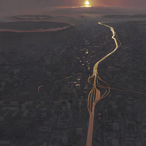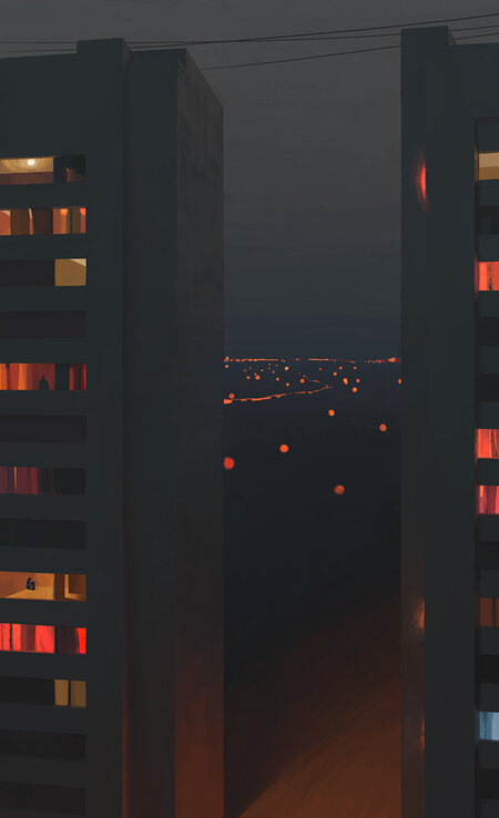Ограниченное освещение, представшее в виде слабых источников света на горизонте или одиноких оконных проемов, функционирует как система визуальных координат в пространстве тотальной тьмы. Уходящие вглубь пространства пустые, безлюдные дороги и лишь точечные яркие цвета вдалеке подчеркивают это состояние. Масштабные фигуры домов и девушки, заполняющие собой все пространство, будто забирают воздух и создают ощущение еще более неблагоприятной и, несмотря на теплый свет, холодной среды.
