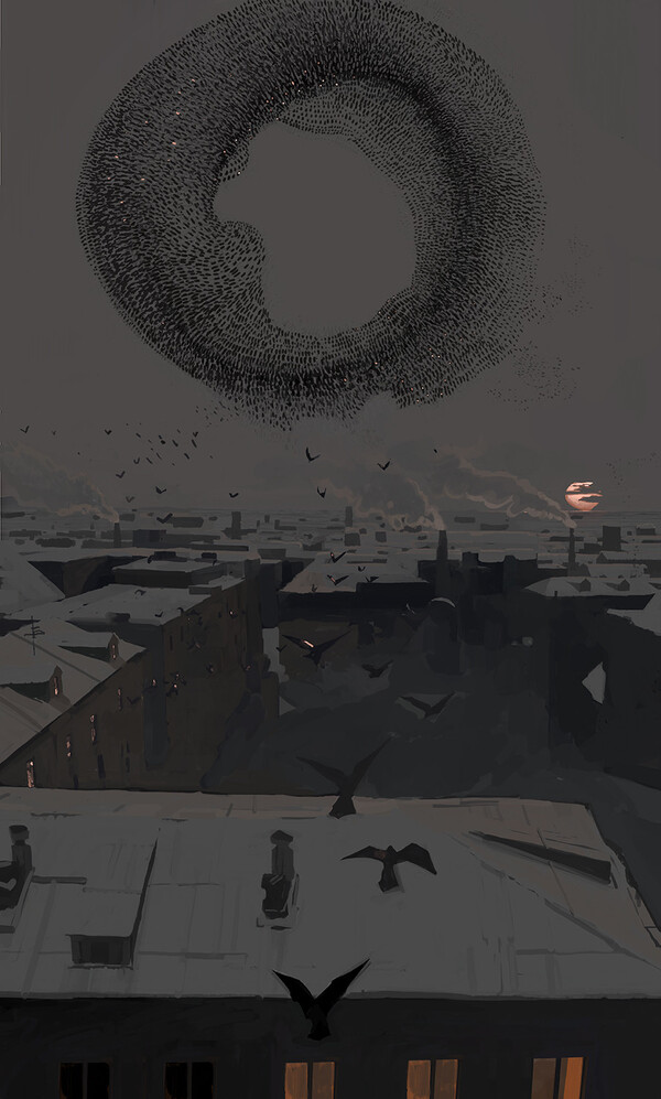 В иллюстрациях А. Сурнова воздушная перспектива не смягчает окружение, а напротив — уплотняет пространство, наделяя его тяжелой, давящей материальностью.