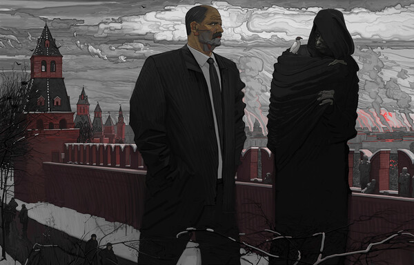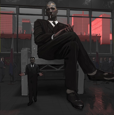Сурнов одновременно ограничивает этих же персонажей рамками композиции. Фигуры, занимающие почти все пространство холста, «втиснуты» в него. Герои иллюстраций почти касаются краев изображения, создавая двойной эффект: с одной стороны — демонстрация власти, с другой — визуализация ограниченности даже для доминирующих сил системы.