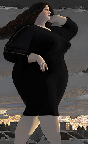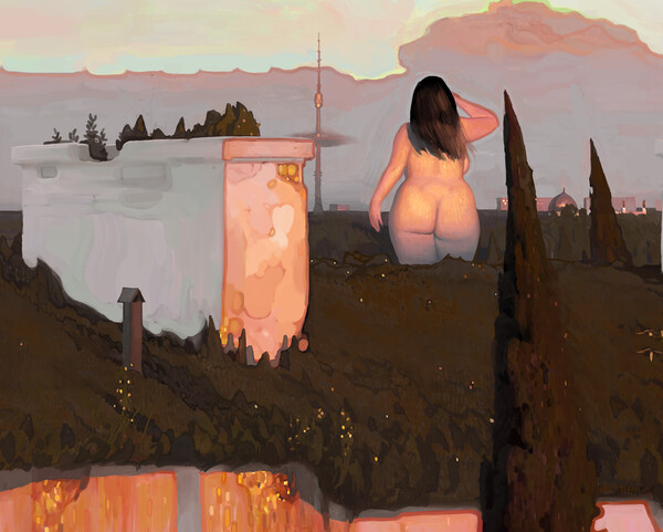 В представленных работах, включая «Смотрящего», гипертрофированный масштаб становится инструментом создания новой мифологии техногенного пространства. Как отмечает сам художник: «Смотрящий на картинке не занимается координацией людей из уголовного мира, он просто смотрит за горизонт, погруженный в раздумья о жизни. Это молодой бог панельных многоэтажек и заставленных автомобилями тротуаров» [5]. Подчеркнуто пустое пространство, почти отсутствие людей на работе создают экзистенциальную природу отчуждения.