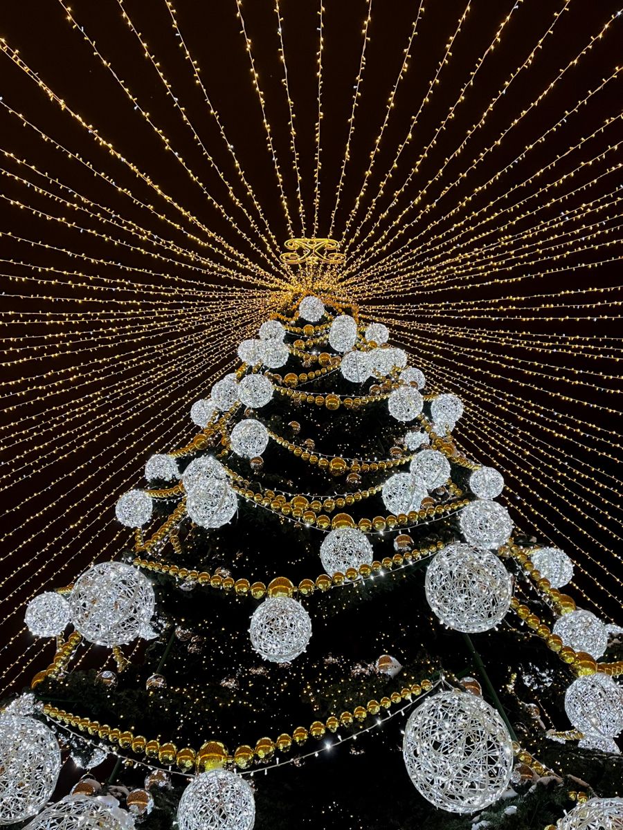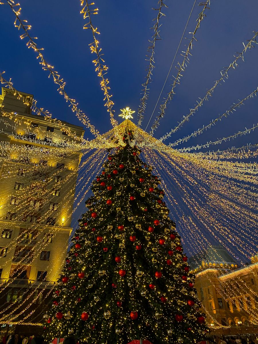 2. Городские ёлки и праздничные площадки. Центральные ёлки — это точки притяжения, городские символы праздника. Вокруг них организуются ярмарки, сцены, катки — то есть формируется полноценное многоуровневое пространство. Высота ёлки, масштаб игрушек, снег вокруг — всё создаёт эффект «театральности», показывая, что праздник — это не случайность, а событие, которое город сознательно создаёт.
