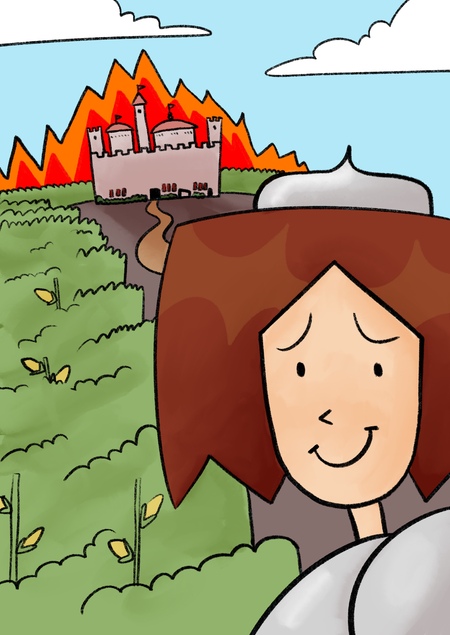 Стражник, пытаясь оттереть пятно, случайно поджигает знамя, из-за которого сгорает уже весь замок.