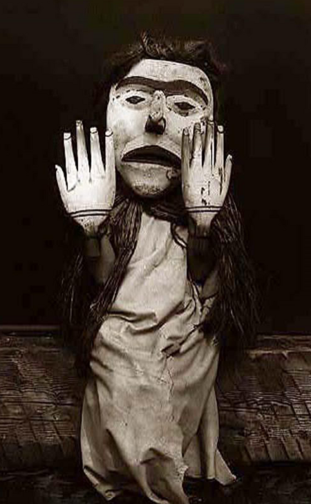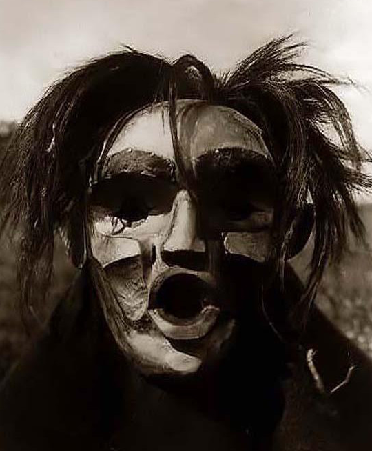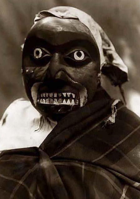 Маска Tsunukwalahl — мифическое существо. Использовалась во время Зимних Танцев. Фото 1914 года.