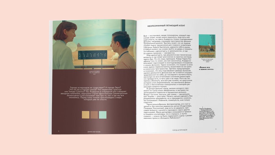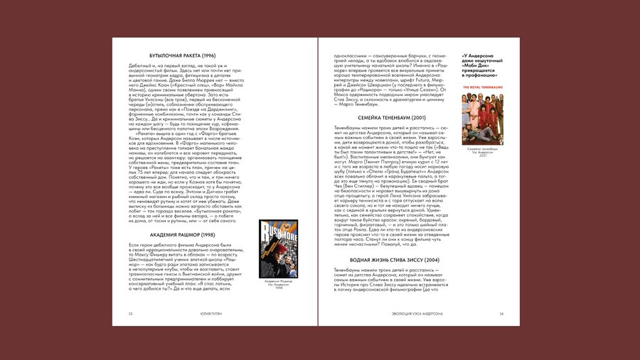 Эта книга является компиляцией статей из журнала «Сеанс». Она исследует визуальный код режиссера Уэса Андерсона, становясь путеводителем по его симметричным мирам. Палитра каждого фильма — ключ к сюжету и настроению: от солнечно-жёлтой меланхолии «Королевства полной луны» до тревожно-алой страсти «Отеля „Гранд Будапешт“.
