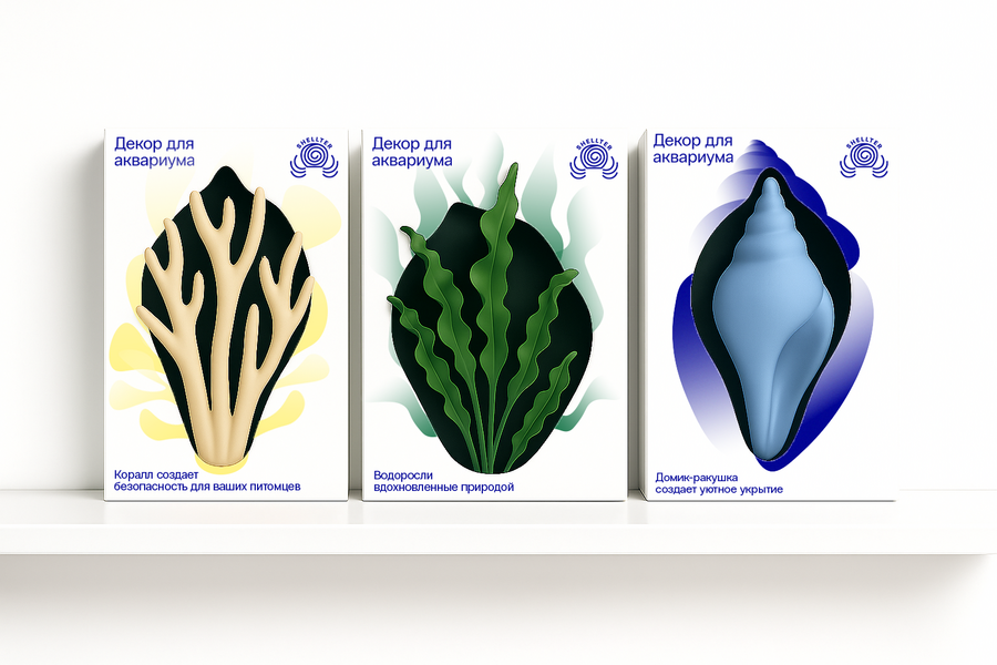 Midjourney — Two product boxes featuring aquarium decor sit side-by-side on a white shelf against a stark white backdrop. The box on the left, labeled «Декор для аквариума» in blue Cyrillic script, displays a stylized, abstract seashell design in shades of orange and cream, conveying a smooth, glossy texture with highlights. The box on the right, also bearing the Cyrillic text, shows an abstract rendering of blue and teal coral shapes with smooth, sculptural forms and the brand logo in the upper right. Both designs exhibit a clean, modern aesthetic with a focus on simplicity and high contrast. The lighting is bright and even, casting minimal shadows, with a perspective that is straight-on and centered. The style is minimalist and clean. --ar 3:2 --q 2 --s 750