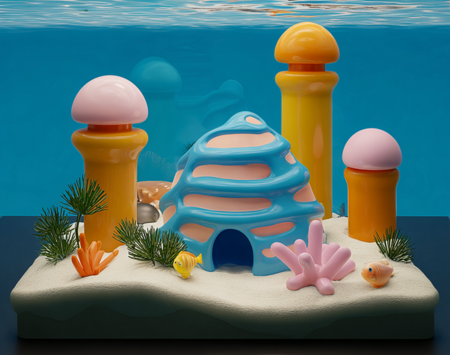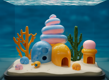 Midjourney — A whimsical underwater diorama, featuring a collection of vibrant, cartoonish structures set on a sandy seabed within a transparent, glass-like container. A large, layered structure resembling a cotton candy-like snail dominates the center, with horizontal bands of pink and blue. Flanking the snail are a blue, dome-shaped house with two holes and a yellow, half-circle shaped house with a round doorway. Additional elements include a coral-like orange structure, a spiky green cactus, a small, pink-and-blue seashell, a yellow submarine toy and a small orange seashell. The background is a gradient of deep blues to simulate water, with subtle, reflective light at the top. The objects are smooth and glossy, giving them a plastic toy appearance, set in a bright, playful environment. Soft, diffused lighting enhances the cheerful, friendly atmosphere. The composition is a medium shot, straight-on perspective. --ar 1:1 --q 2 --s 750