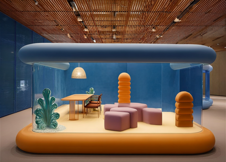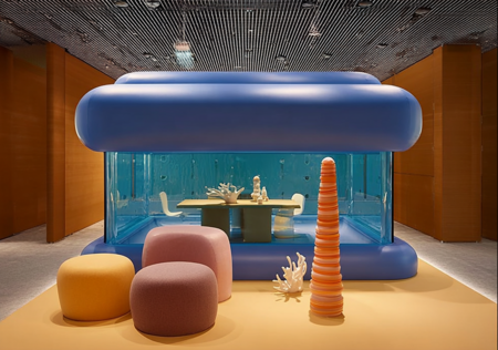 Midjourney — A surreal interior design concept featuring a central, enclosed structure resembling an oversized, light blue inflatable with rounded edges. Inside this transparent chamber, a dining table is set with abstract, white ceramic sculptures and two white minimalist chairs. The walls of the chamber are a translucent turquoise, giving the impression of an underwater environment. Surrounding the chamber are three padded, cube-shaped stools in pastel shades of yellow, pink, and mauve, along with a coral-shaped sculpture in white. A tall, cylindrical sculpture made of stacked orange and white rings stands next to the chamber. The floor is covered in a flat, mustard-yellow surface, with a contrasting light gray carpet in the background. The ceiling is made of parallel metal slats, and the walls are panelled with warm, wooden textures, lit by recessed lighting. The overall composition is a front-facing shot with a focus on geometric shapes, soft lighting, and a playful, dreamlike atmosphere. Art Deco design influence, studio lighting, hyperrealism. --ar 3:2 --q 2 --s 750