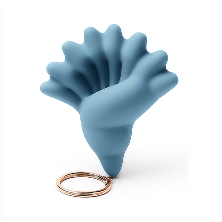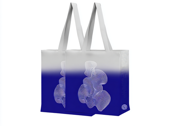 Midjourney — 1. A stylized, abstract sculpture is centered in the frame against a stark white background. The sculpture is a monochromatic, light blue, organic form, reminiscent of a stylized flower or a seashell, featuring curved lines and smooth surfaces. The upper section displays a scalloped, petal-like structure, while the lower part tapers down to a conical base. Attached at the bottom is a gold-colored, circular key ring. The sculpture stands upright, with a slight tilt towards the viewer. 2. A tote bag, centered and against a stark white background, is shown. The bag has a gradient design, transitioning from white at the top to a deep royal blue at the bottom. Two matching white handles are visible. The perspective is a straight-on shot, with even lighting, emphasizing the colors and the abstract pattern.