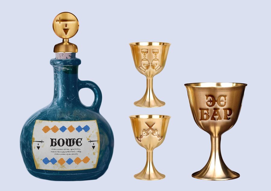 Промт: create a medieval bar counter, two knights sit on the chairs near the bar counter, old medieval glasses of wine are on the bar counter, a big gothic bar cabinet with shelves lined with different strange bottles of different sizes and different colors, torches on the walls, candles, small amount of light, photorealistic