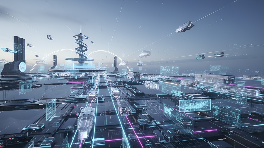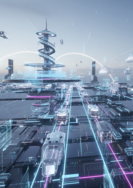 Prompt: Create a metaverse that is located in the sky. The metaverse is a transitional point for data transportation. The data is being transported in cloud-like vehicles. Make it futuristic.