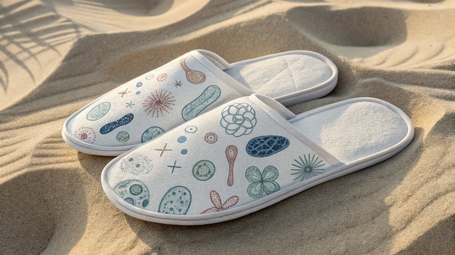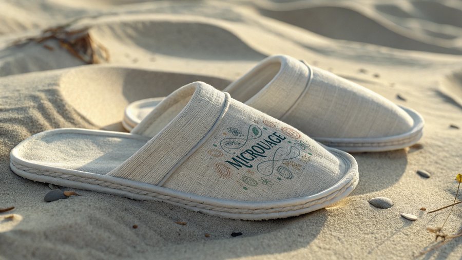 Промт: Photorealistic close-up photo of a pair of white fabric slippers withminimalist microbial-inspired pattern featuring organic microscopic shapes, soft rounded cells, spores, dots, and bio-like textures derived from the logo’s forms. Use blue, green and rose colors on the t-shirt. Clean modern aesthetic, subtle scientific mood, balanced repetition, harmonious spacing. Flat vector-style design, smooth curves, consistent line weight, restrained color palette matching the microuage logo branding. lying on soft beach sand. The slippers are made of textile material with visible weave, stitching, and gentle wrinkles in the fabric. Natural grains of sand partially covering the slippers, small shadows between sand particles. Warm natural sunlight, soft highlights, realistic shadows