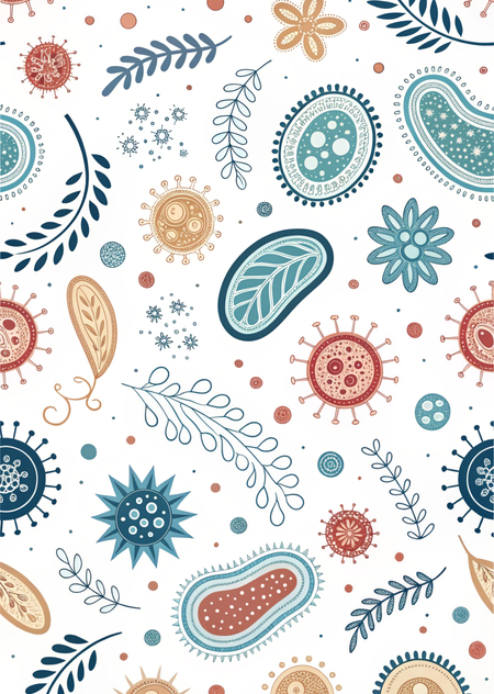 Промт: Seamless pattern and abstract ornamental design based on the visual identity logo. Minimalist microbial-inspired pattern featuring organic microscopic shapes, soft rounded cells, spores, dots, and bio-like textures derived from the logo’s forms. Clean modern aesthetic, subtle scientific mood, balanced repetition, harmonious spacing. Flat vector-style design, smooth curves, consistent line weight, restrained color palette matching the microuage logo branding. High clarity, scalable design, white or light background, no text, no 3D, no gradients, no shadows, seamless tiling pattern, professional brand pattern.