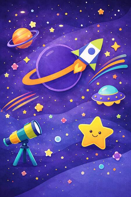 Метафора: Космос, собранный из детского конструктора или аппликации. Визуал: Четкие, округлые геометрические формы (круги-планеты, треугольники-ракеты, звезды из линий). Палитра — глубина космоса (темно-синий, фиолетовый) + акценты энергии и радости (желтый, оранжевый, кислотно-зеленый). Иллюстрации: Стилизованные, будто нарисованы толстым фломастером или вырезаны из бумаги. Преимущества: Максимально адаптивен, выглядит современно и по-детски, но по-взрослому качественно. Легко анимируется для соцсетей.