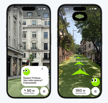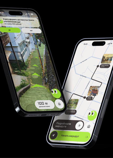 Так, было принято решение при сценарии, когда пользователь следует по построенному маршруту, выводить на экран вид места от первого лица и небольшие подсказки-указатели, что облегчило следование маршруту.