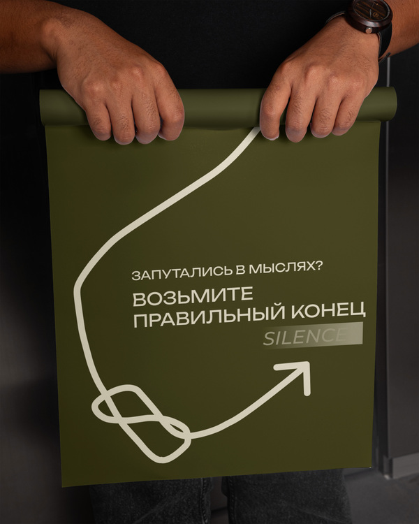 Основным рекламным инструментов для бренда успокаивающих сфер «SILENCE» я выбрала метафору. Постеры и билборды сравнивают запутанные тревожные мысли с клубком пряжи, который можно распутать, потянув за 1 верную нить.