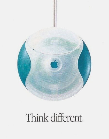 В первую очередь на ум приходят некоторые из рекламных плакатов Apple «Think different». Они без лишней информации демонстрируют продукт и призывают зрителя «думать иначе». Не бояться выделяться, также как сам бренд не боялся выделяться дизайном своей техники из огромной массы серых и унылых ящиков, какими был заполнен рынок персональных компьютеров в то время.