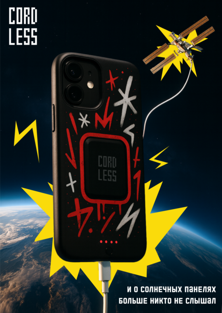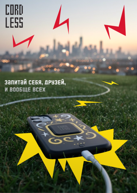 В своём скетче я подчеркнул преимущество использования чехлов Cordless в виде бесконечной связи. Контраст в размерах блоков текста привлекает внимание зрителя к главному — с чехлами Cordless тебе никогда не нужно заряжать телефон, а значит ты всегда готов к звонкам и сообщениям.