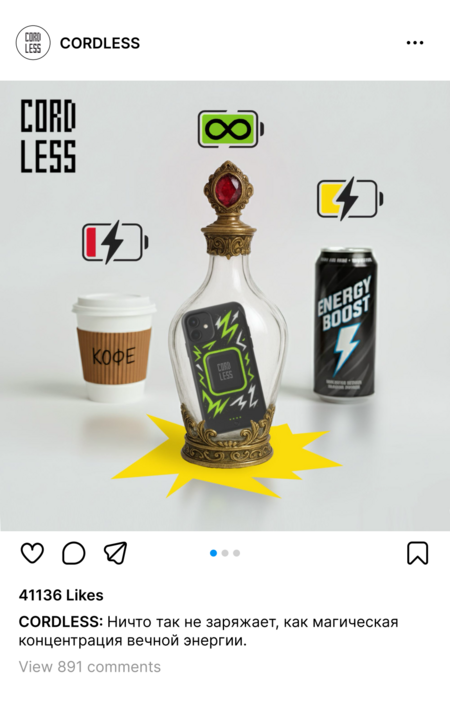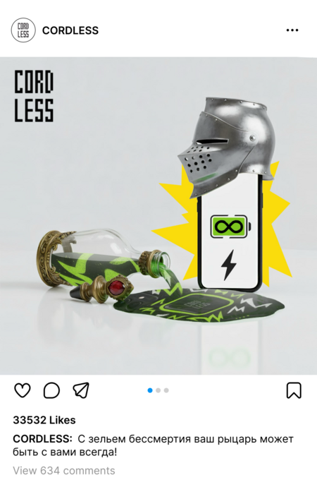 В итоге, для создания финальной рекламной кампании бренда Cordless был выбран прием «метафора», а именно ее визуализация с использованием зелья бессмертия и фэнтезийно-средневековых элементов. Выбрано такое решение потому, что подобная эстетика является нетипичной для бренда электроники. Это хорошо работает на узнаваемость бренда.
