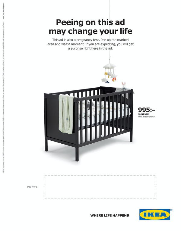 «Peeing on this ad may change your life» IKEA 2018 url:https://campaignsoftheworld.com/wp-content/uploads/2019/07/IKEA-Pee-Ad-COTW-1.jpg (Дата обращения 18.11.2025)