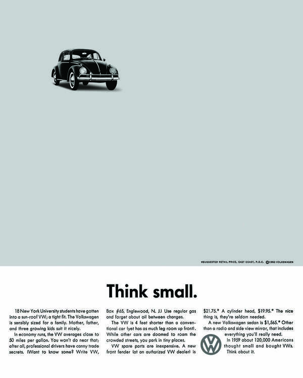 «Think small» Volkswagen 1959 url:https://payload.cargocollective.com/1/5/187927/14322304/Think-Small_1340_c.jpg (Дата обращения 19.11.2025)