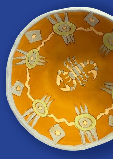 Изобразить на дне чаши скорпиона, используя способ сграффито, а борт чаши украсить орнаментом, сочетающим в себе округлые и острые формы.