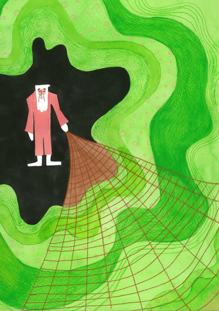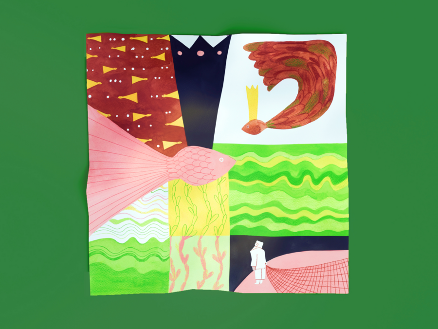 По мотивам сказки «О рыбаке и рыбке» А. С. Пушкина я создала серию иллюстраций для платков. В качестве материала я выбрала акварель для заполнения объемов и создания полупрозрачной текстуры воды, а карандаши для доработки деталей. В выборе колорита я сделала акцент на контраст по тону с использованием черного и белых цветов, а также контраст по цвету с помощью комплиментарных пар.