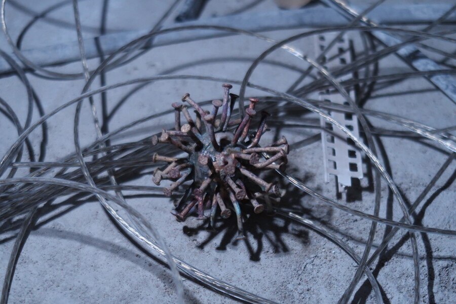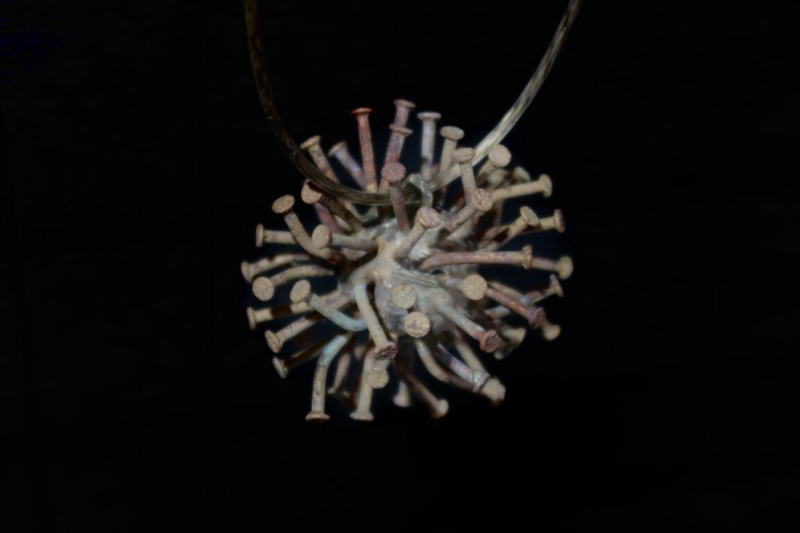 Изначально, прощупывая работу с металлом, я создавала сферу из листа металла на наковальне, а гвозди планировала отлить и приварить к сфере