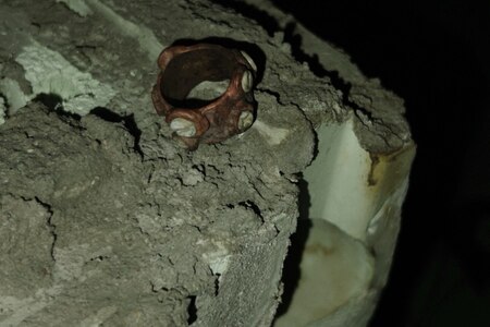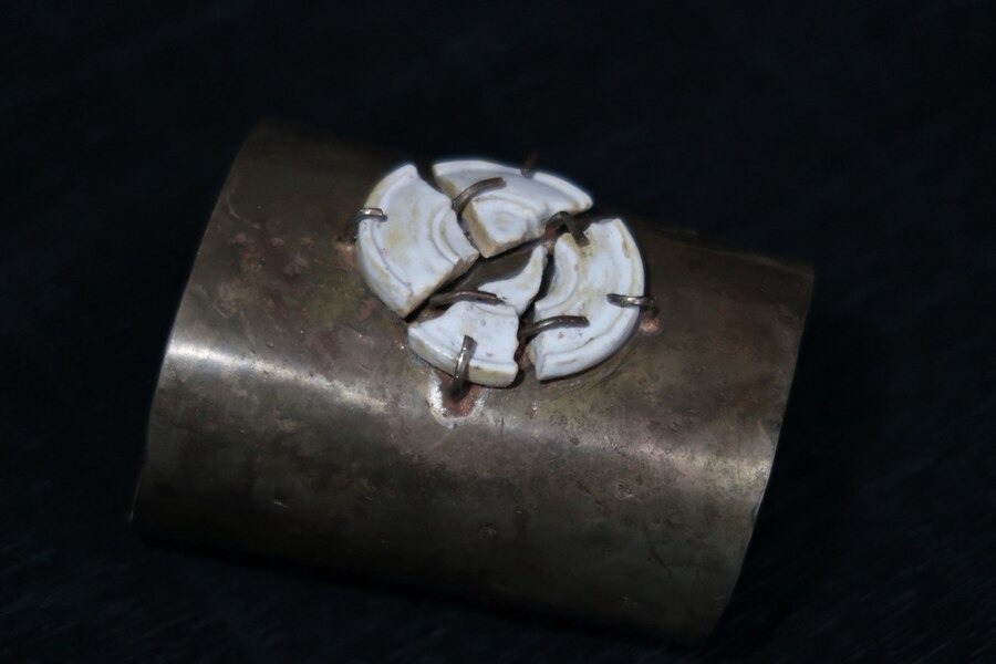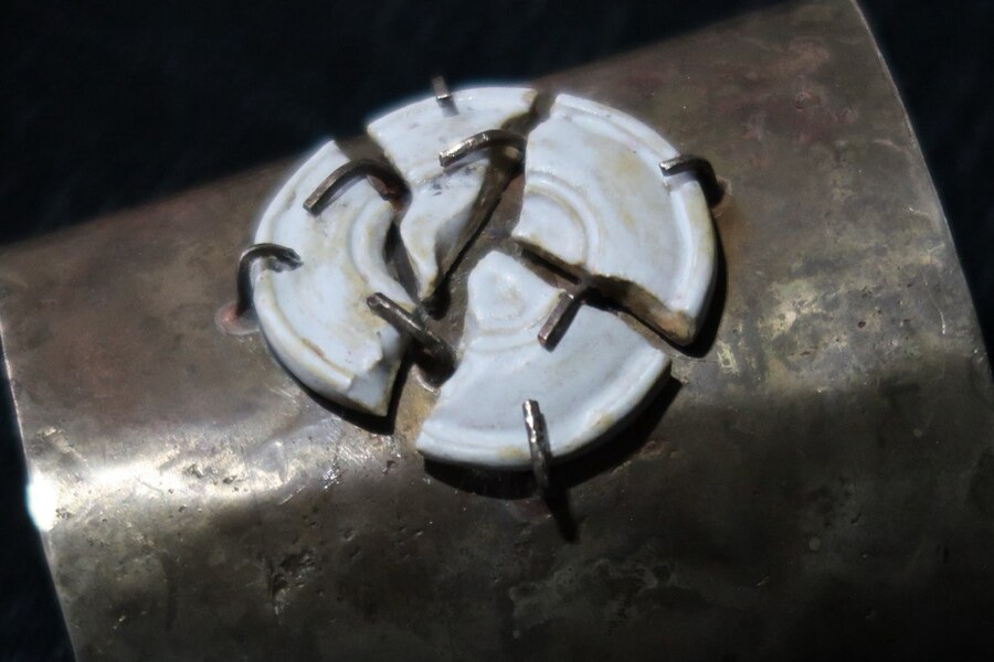 Кольцо было разрезано на пополам и прикреплено к керамике с внутренней стороны с помощью ювелирного клея, а также дополнительно укреплено крапанами, расположенными по всему диаметру